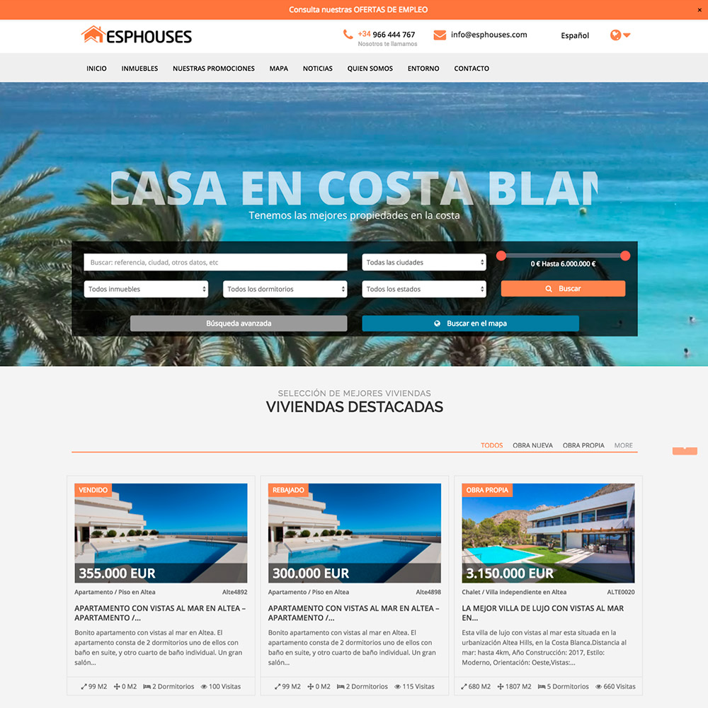 ESPHOUSES es una empresa especializada en la gestión inmobiliaria en España que ofrece servicios integrales en el ámbito residencial (construcción, promoción y venta). La entidad tiene como zona de actuación geográfica la Costa Blanca, con productos en los más bellos pueblos costeros de la provincia de Alicante: Guardamar del Segura, La Mata, Torrevieja, Santa Pola, Alicante, El Campello, Benidorm, Altea y Calpe.