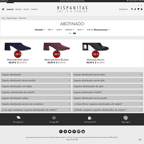 Desde Hispanitas, conscientes de la importancia vital que tiene el comercio electrónico en la sociedad, más si cabe en el sector del calzado, contactaron con Coodex para trasladarnos su preocupación por el estancamiento del tráfico orgánico que tenía su tienda online desde hacía ya bastante tiempo. Sabían que alcanzar mejor ranking en las keywords o palabras clave más importantes de su sector llevaría inevitablemente a mejorar sus ventas online, ya que son fabricantes de un producto de altísima calidad tanto en materiales como en sus procesos de fabricación.
