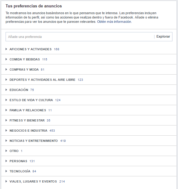 De esta manera, podemos editar nuestras preferencias añadiendo o eliminando ítems de esta lista para que así se nos muestren únicamente los anuncios que realmente nos interesan. Además, el equipo de Facebook también está trabajando para que este listado aparezca de una forma más intuitiva, ya que en la actualidad, se muestra de una manera más técnica.