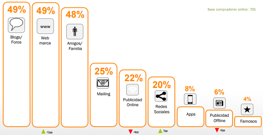 Existen muchas formas de conseguir que los usuarios confíen en nosotros y terminen convirtiéndose en clientes. En este gráfico podemos observar las principales fuentes de las que obtienen información y quiénes son los que guían a los usuarios hacia las tiendas online: